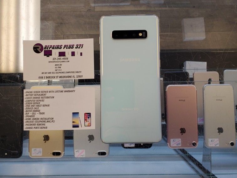 We have a white unlocked Galaxy S10 Plus 128gb for sale! It comes with a 60 Day Warranty! Charger included! We offer financing and we even give you a chance to extend the warranty to one year! Come Visit Repairs Plus 321! We have many other iPhones, Samsung, Macbooks, and Apple Watches for sale!