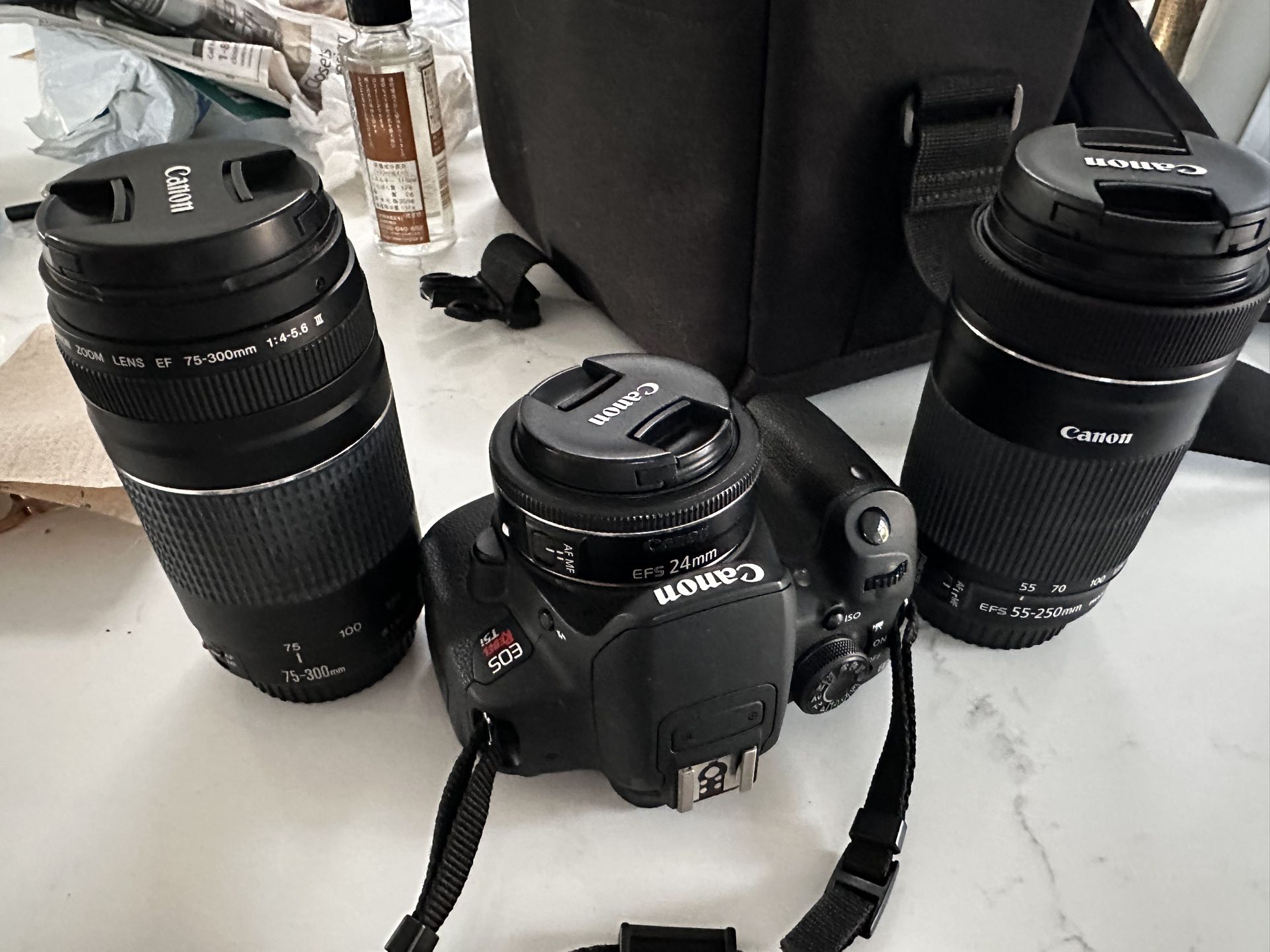 DSLR camera comes with 3 lenses and lots of spare batteries. Included lenses are worth $700+ alone Lenses: EFS 24mm f/2.8 EFS 55-250mm f/4-5.6 EF 75-300mm f/4-5.6