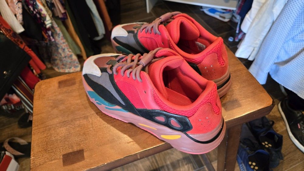 Up for sale are the Adidas Yeezy Boost 700 Hi-Res Red HQ6979 men's shoes. They are a stylish sneaker featuring a low top design, standard shoe width, and a suede upper material. This model is part of the adidas Yeezy product line and is designed for athletic activities such as boxing. The vibrant red color adds a pop of color to any outfit, making it a fashionable choice for men looking for a bold and comfortable shoe option. Shoes are barely used and show almost no ware and are in excellent shape-- see photos. Barely used them and don't really use them out and about, hence the reason for selling. Super rare color combo. I don't have the original box.