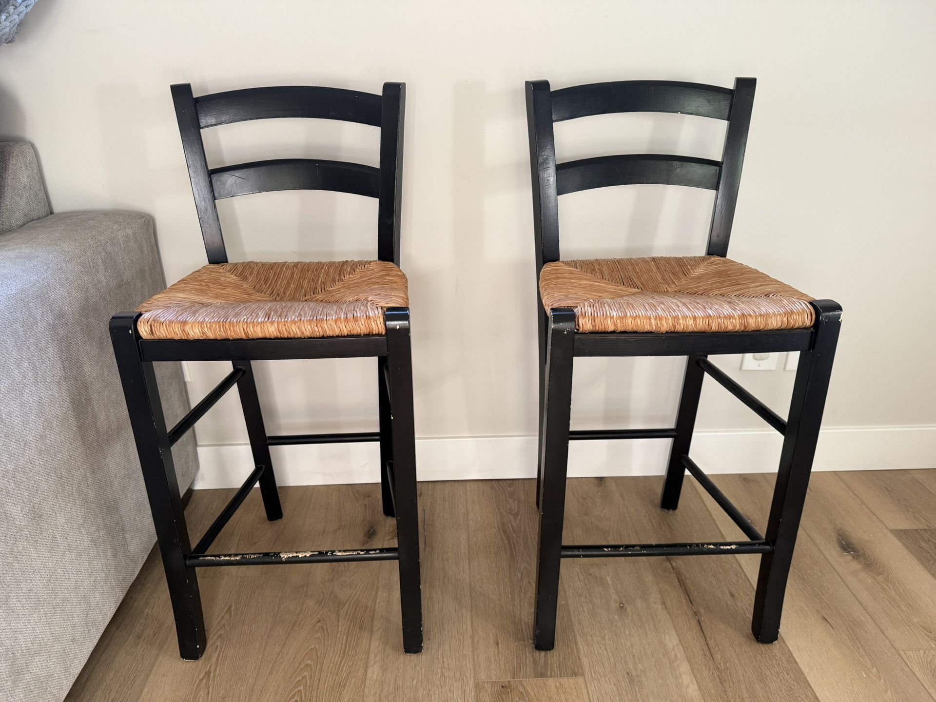 2 chairs ($25 each) both sturdy and not broken. Black paint worn in some spots but tan seats in good condition.