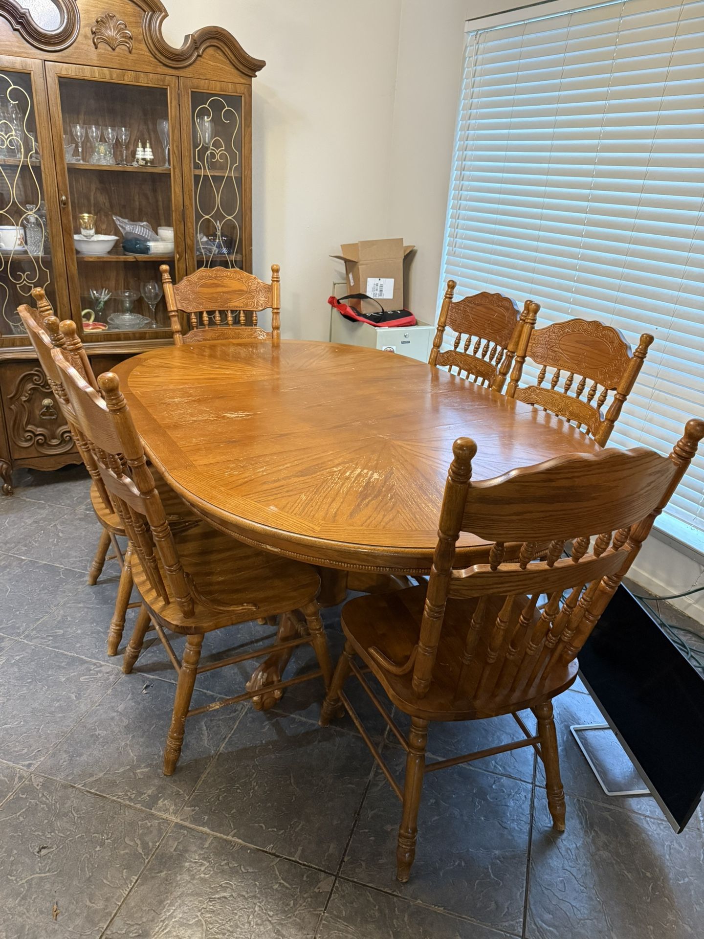 Dining table with 6 chairs. Leaf can be removed to make table smaller. Has imperfections on legs of table, but could be sanded down and refinished.