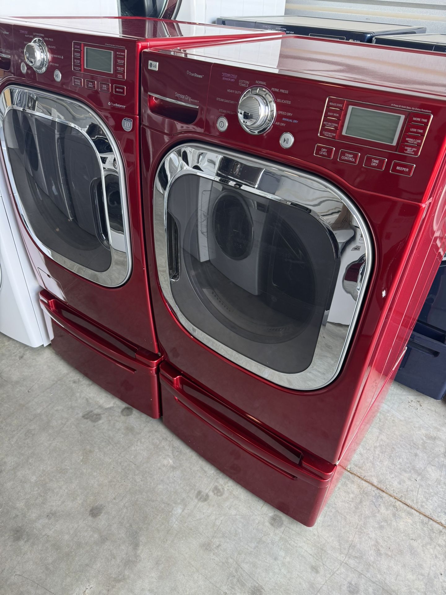 Front load LG washer and front load LG dryer square doors red color high efficiency with pedestals
