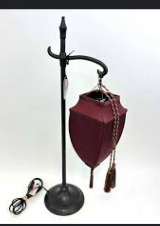 Pottery Barn 29” bronze lamp with red silk linen shade Switch on cord for high or low or off.