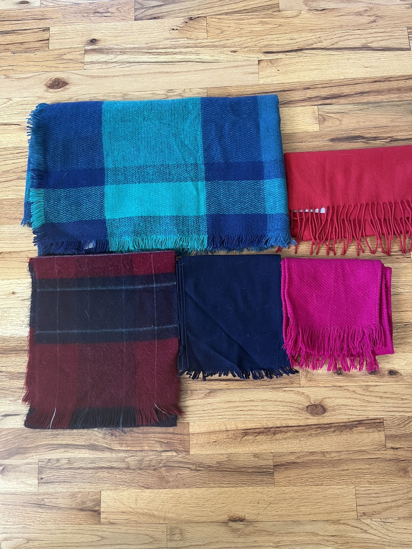 Listed price is for all 5 If requested will sell individually Smoke free home All 100% acrylic Red is croft and barrow L 52”, W 11” Pink L 54” W 7” Navy blue L 68”, W 8” Red and blue plaid L 52”, W 11” Blue and green plaid L 80”, W 24” No rips, tears or stains in the fabric