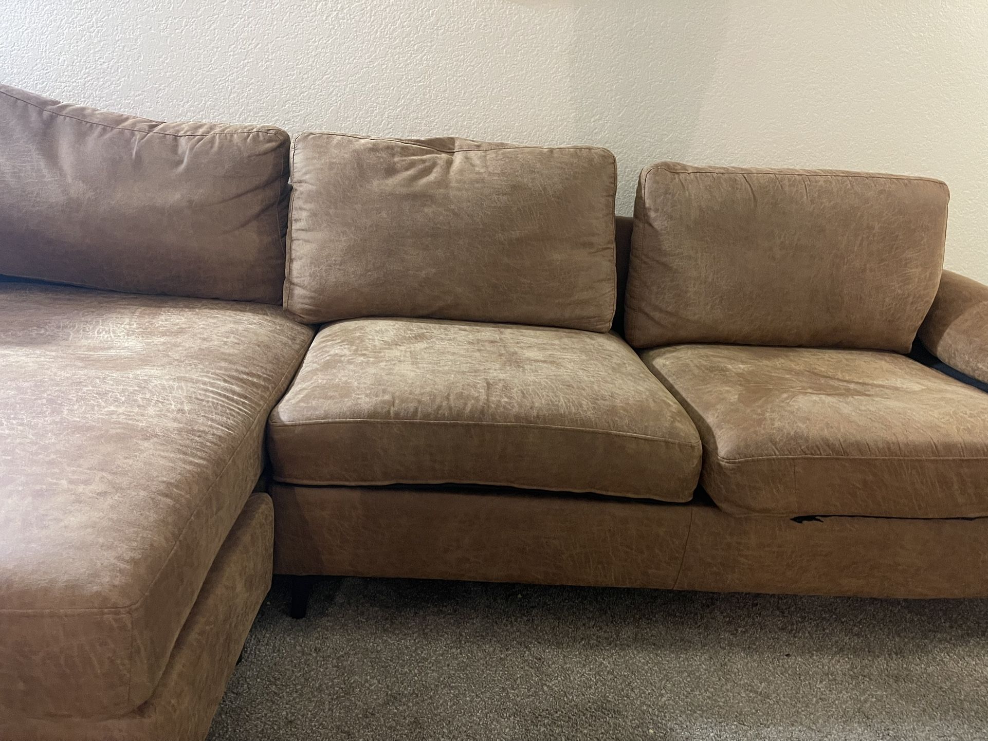Spacious and comfortable L-shaped sectional sofa in a rich brown faux leather. * 100-Inch Wide, 3-Seater + Chaise Lounge. Configurable as Right or Left-facing. * Convertible Chaise for flexible living room layouts. * Premium Faux Leather – soft, durable, and easy to clean. * Deep seats with high-density foam for comfort. * Condition: Very good. Used in a pet-free home. No tears.