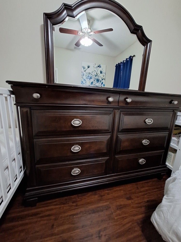 Very modern looking dark brown Kanes Furniture dresser/mirror for sale. This dresser is solid wood and has 8 drawers to hold all your clothes. There are some wear marks on the dresser from moving.