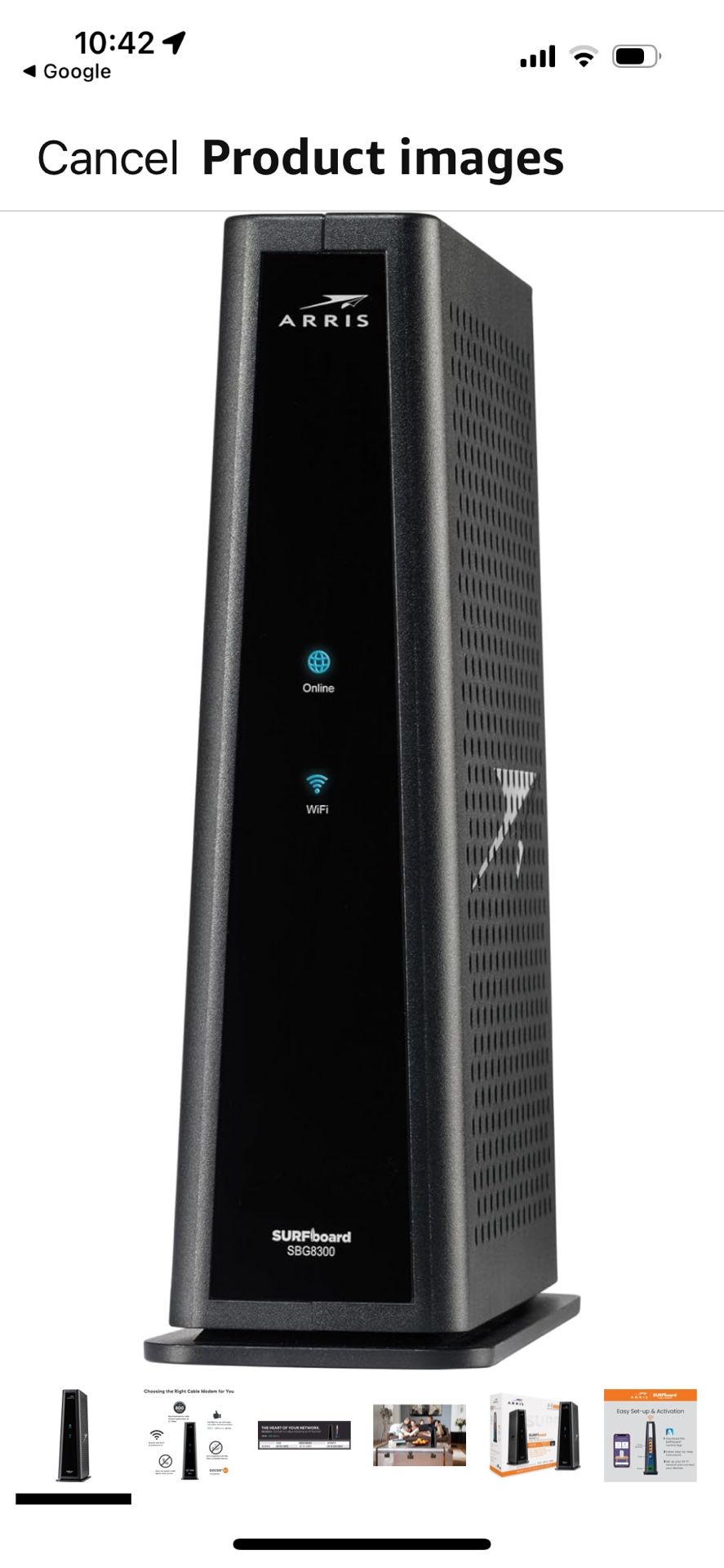 Brand ARRIS Internet service provider Cox Connectivity technology Wi-Fi, Ethernet Compatible devices Personal Computer, Smart Television, Smartphone Product Dimensions 20.3L x 7.3W x 23.7H Centimetres Total Ethernet ports 4 A Trusted Name in Home Connectivity: Get high speeds, low latency, and a two-in-one product! With the ARRIS SURFboard SBG8300 Wi-Fi Cable Modem, you will increase your network capability and get ultra-fast streaming and downloading throughout your home. From a trusted brand with over 260 million modems sold and growing. Save Money: Own your modem and save. Reduce your cable bill up to $168 dollars per year in cable modem rental fees (Savings vary by cable service provider). Certified for use with most U.S. cable internet service providers. For a complete list see additional details below. Modem Technology: DOCSIS 3.1 is the newest technology available from cable internet providers. Its 10x faster than DOCSIS 3.0, provides better security, reduces lag while gaming & enables multi-gig networking (ability to run fast speeds on your copper cable from your internet provider). Simple and Secure Set-up: Just plug-in, download the SURFboard Central App, and follow the step-by-step intrstuctions to activate the modem, set-up and customize your Wi-Fi network, and add devices to your home network! Once setup is complete, the app provides real-time monitoring of the devices on your network, enhanced parental controls like setting time limits and pausing internet and much more. Compatibility: The SURFboard SBG8300 is compatible with major U.S. cable internet providers including Cox (Gigablast), Spectrum (Internet Gig), Xfinity (Gigabit/Gigabit x2) and others. It's approved for cable internet speed plans up to 1 Gbps. Check your Internet Service Provider (ISP) website to confirm compatibility.