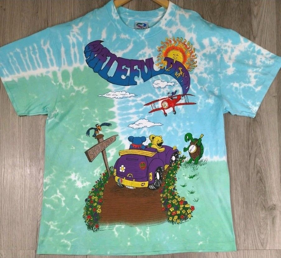 Step back into the psychedelic world of the early ‘90s with this authentic 1992 Grateful Dead Spring Tour Liquid Blue tie-dye shirt. Bursting with vibrant color, this double-sided masterpiece features the legendary dancing bears cruising in a purple peace-sign car, a banjo-playing turtle, and trippy sky details that only Liquid Blue could capture. The back showcases the full jam session with the bears and turtle, stamped with the official ©1992 GDM, Inc. license. Made in the USA on a true vintage Liquid Blue XL tag, this shirt isn’t just clothing—it’s a piece of rock history. The colors are still loud, the artwork is bold, and the vibe is unmistakable. Whether you’re a Deadhead collector or chasing that one-of-a-kind vintage grail, this shirt demands attention.