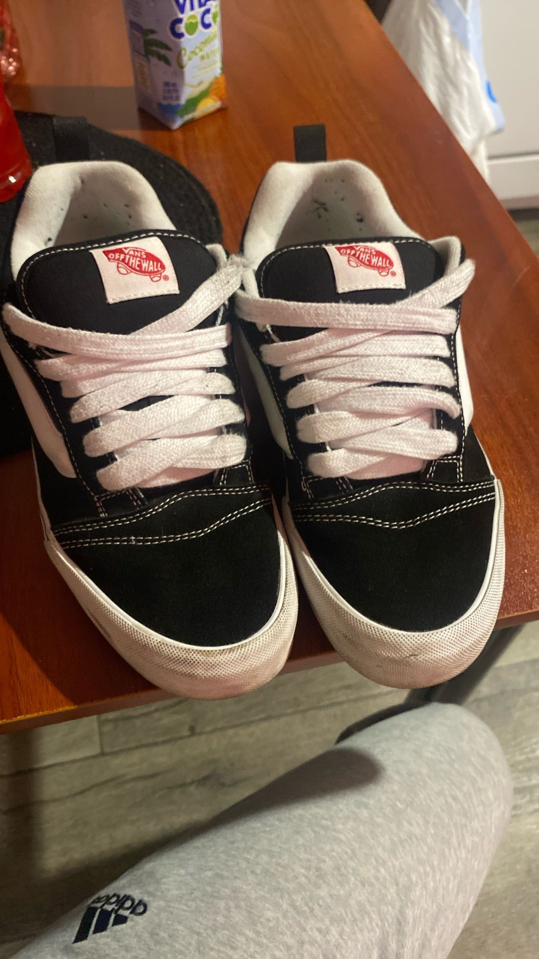 NO BOX they have been worn more than once they dont have any scratches or tears just a couple dark marks