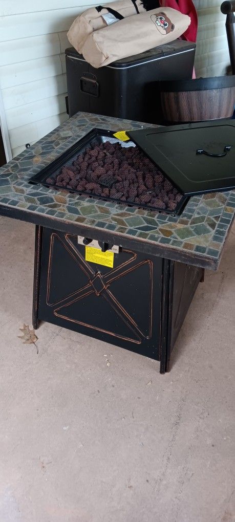 Outdoor patio gas/propane fireplace like new with tile top bronze color