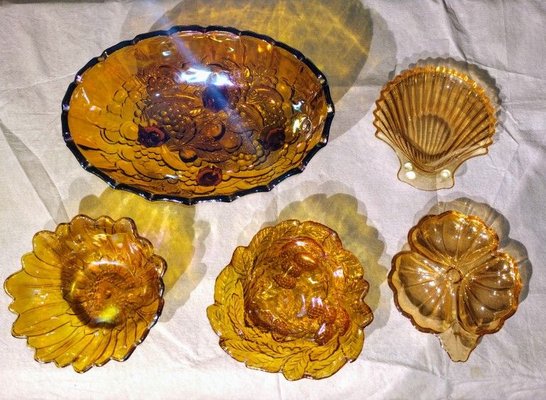 Marigold Carnival Glass Harvest Grape. 1- large oval fruit bowl, footed. $25 1- amber lilly candy dish $15 1- Loganberry bowl $15 1- clover dish $12 1- shell dish $12 And 1 - colony harvest blue cobalt marigold canister no lid. $20 $40 takes it all. Very good condition, no cracks.