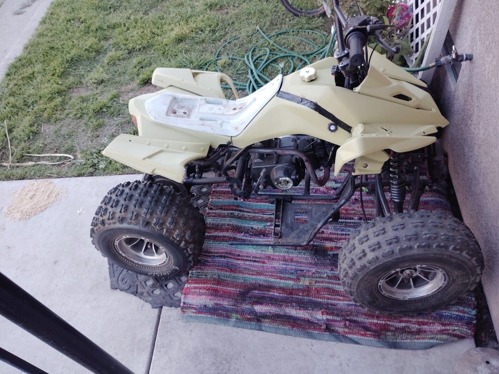 This is considered a midsize ATV Customized quad ATV, starts runs drives just need some TLC and tuning getting rid of it because tired of hearing the owner of the property complain brand new carburetor,new manifold all new wiring harness kickstart with keys looking to trade for a street legal scooter,dirt bike or $350 don't be afraid to ask I like projects(this one just took too much time and too many people are complaining