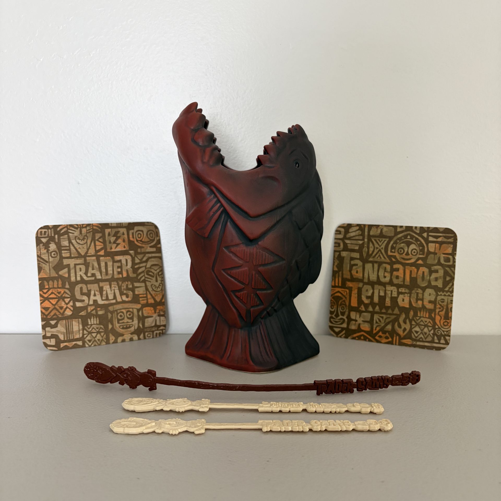 Selling my Disney Trader Sam's Piranha ceramic mug. It comes with the original box, two Trader Sam's Tangaroa Terrace drink coasters, and a few swizzle sticks.