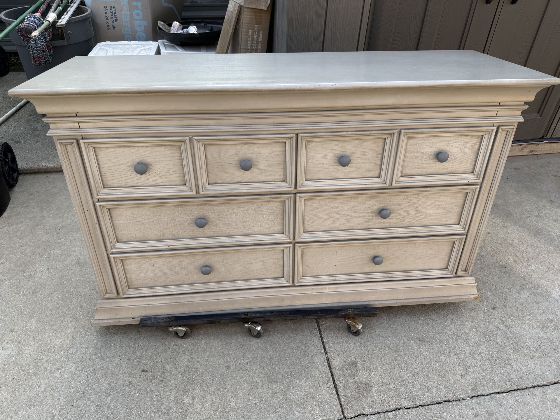 Large 6 drawer dresser Baby Cashé brand. Used but in good condition, some scraches and chipped on the bottom right (see all pics). All drawers work great, holds alot of clothing. Grey color but can be repainted any color 60 wide 30 tall 24 deep