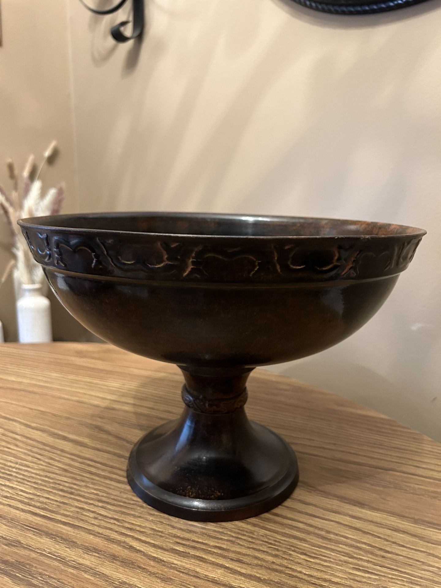 Large decorative Compote bowl Approximately 8 1/2 inches tall by 12 inches round. Shades of brown. Preowned good condition. Felted bottom.