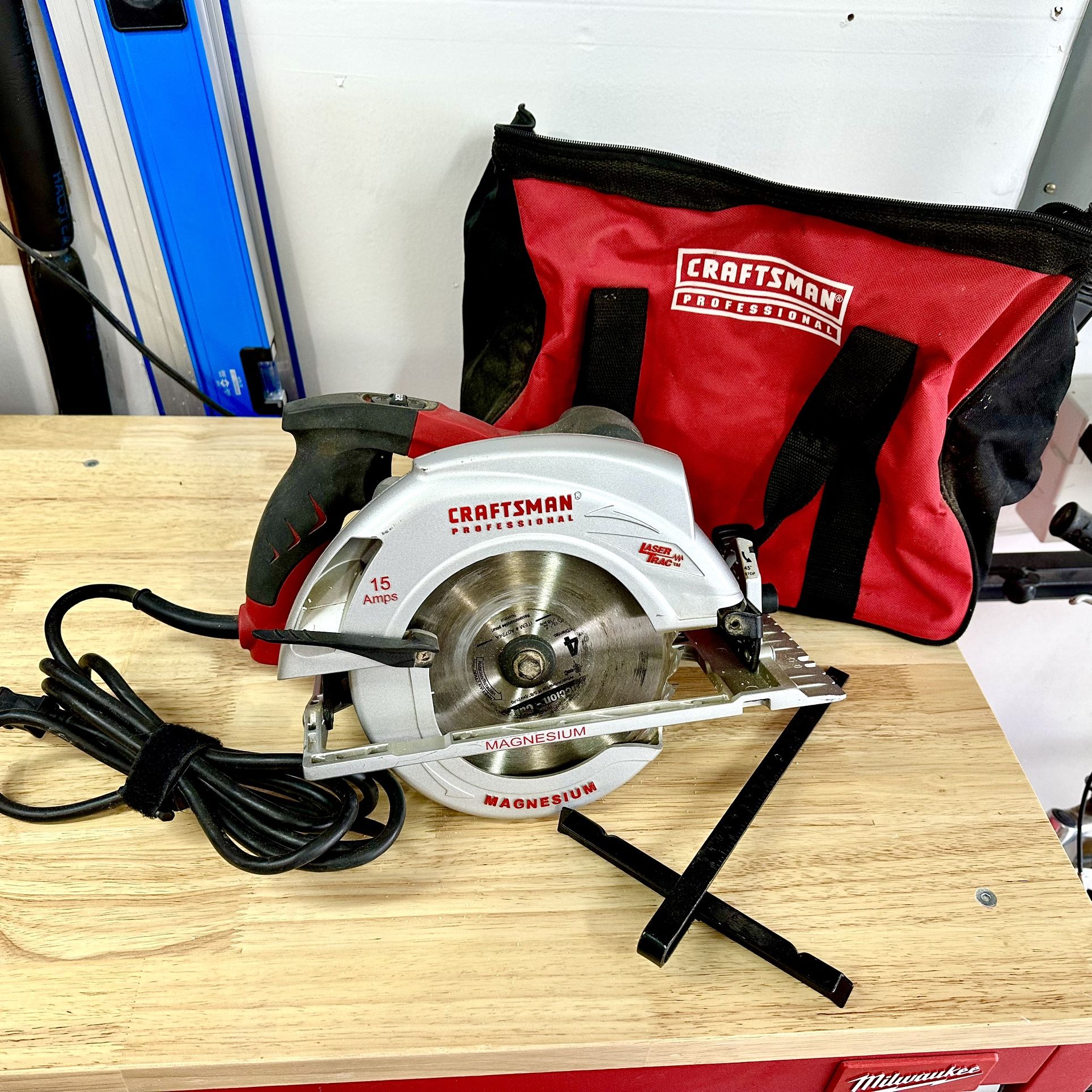 7 1/4 inch Craftsman Circular Saw with guide and bag. Saw features a work light and laser guide line. Excellent condition.