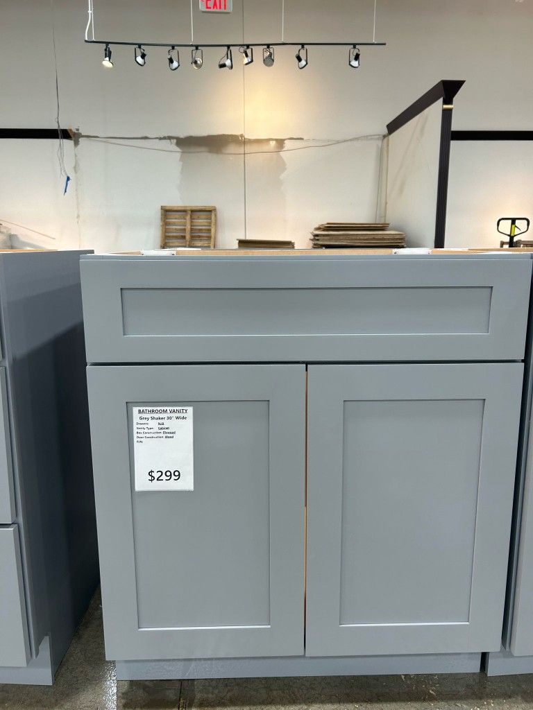 BATHROOM VANITY Grey Shaker 30'' Wide Drawers: N/A Vanity Type: Cabinet Box Construction: Plywood Door Construction: Wood Price: $299