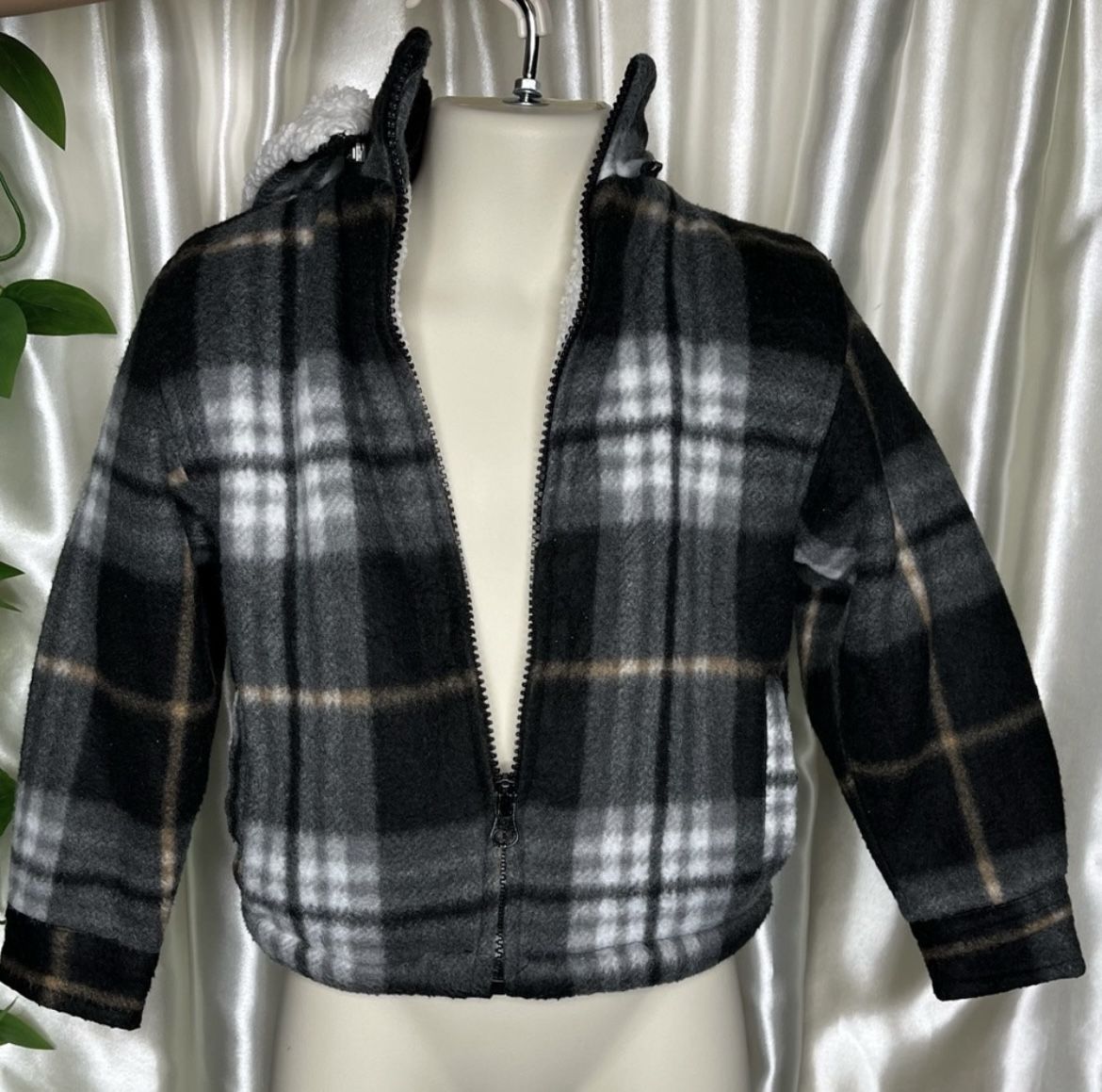 Stylish plaid zip-up jacket in black, white, and tan. Perfect for layering.size 4 T