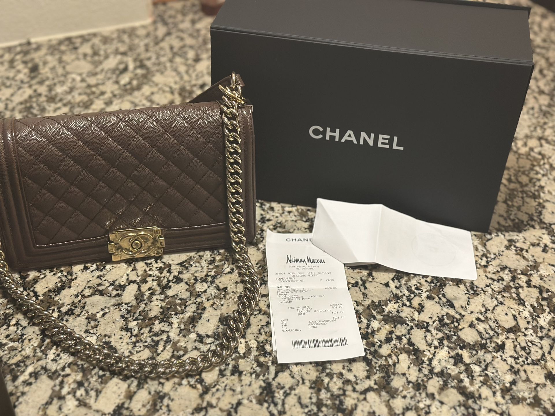 Only used a few times purchased at Chanel in Neimans for 7,300 , happy to meet at the Chanel store in Scottsdale fashion square to validate authenticity. Have gone to both of the retail boutiques in old town and Kireland they have very used chanel bags that are not even close to good condition and no dark brown for 5,500 .