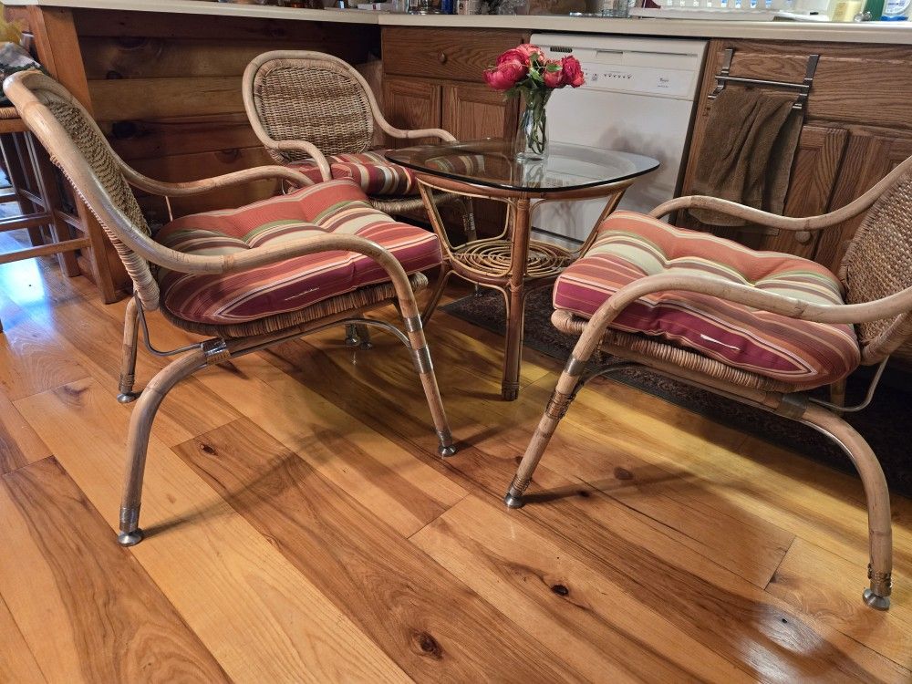 RATTAN chairs-3 pc by,designer MATS Theselius,unlimited edition WHERE WAS STEEL CORD DAMAGE,WAS REPLACED WITH STAINLESS TIES.Chairs are strong,no damage on wicker,you can have also 3 cushions,if you like,plus cocktail table.Please see pictures for details.Those are very expensive chairs,you can see online.