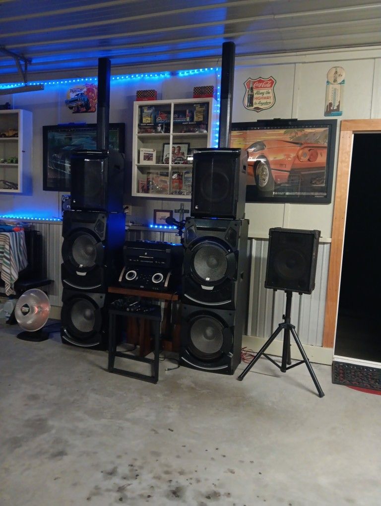 Check it out! Look it up and make offer sounds great all speakers are loud !! 10.000 watts system .and karaoke π€ system !! MAKE OFFER!! Or trade what do u have? There are actually 2 systems !! 15" sobwelfers lots of options with the system!!!