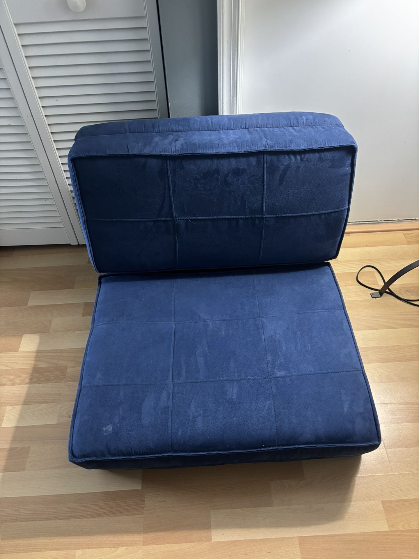Fold out chair bed, very comfortable, 6 feet in length, blue color. Excellent condition.