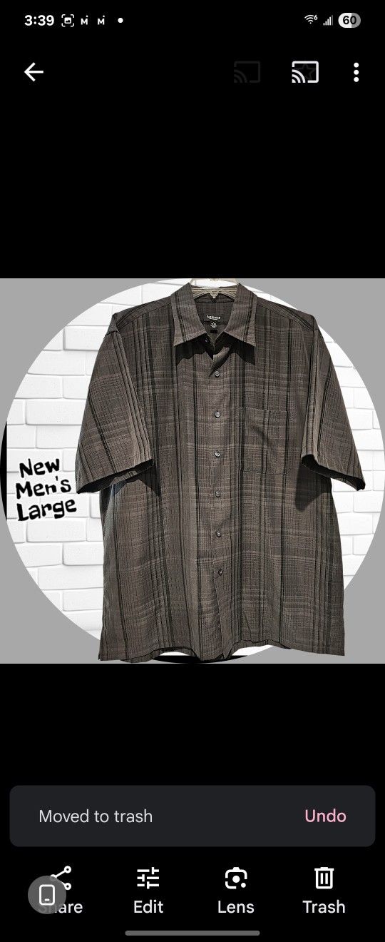 NWOT • Button Down Short Sleeve Shirt • Casual Dress Shirt • Size Large • Lightweight & Cool • Collared • 1 Chest Pocket • Dark Gray with Lighter Gray & Black Lines • 2 Extra Buttons on Inside Hemline • Side Slits at Hemline adds Style when worn Out