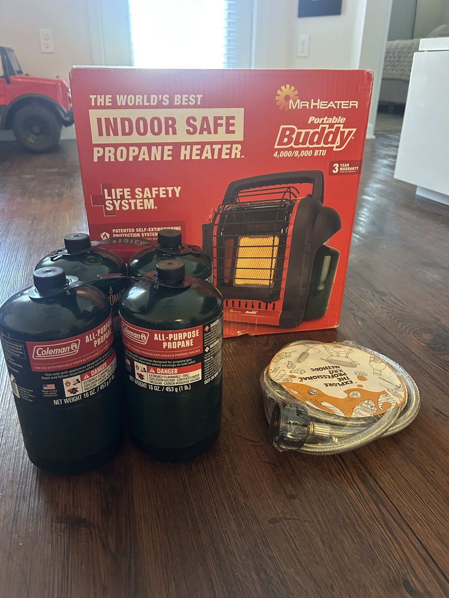 Brand new, never opened complete kit. Includes: ✔ Mr Heater Portable Buddy (Indoor Safe Propane Heater 4,000–9,000 BTU) ✔ 4 Coleman 1 lb propane cylinders ✔ Hose/adapter for larger propane tank ✔ Everything new in original box Perfect for camping, emergencies, cold weather, or hurricane season. Ready to use immediately. 2 kits available. Discount if you buy both.