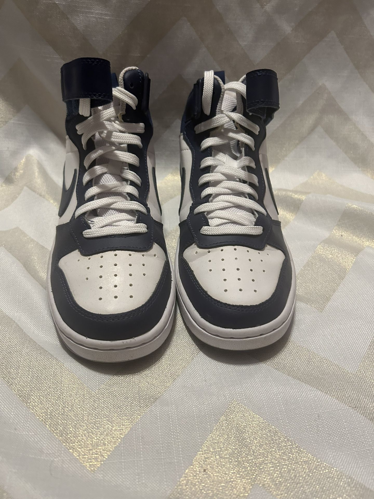 Nike Court Borough Mid 2. Designed with a classic mid-top style and durable leather upper, these sneakers look stunning beyond words. The padding around the tongue and ankle keeps your boys comfortable as they play, while the grooves in the sole provide flexible traction during their fastest sprints. Help your kids move like their favorite heroes with the Nike Court Borough Mid 2. Traditional laces provide a secure fit. Cupsole construction offers a classy look and feel. Size 5.5 youth Used / good condition $40 obo