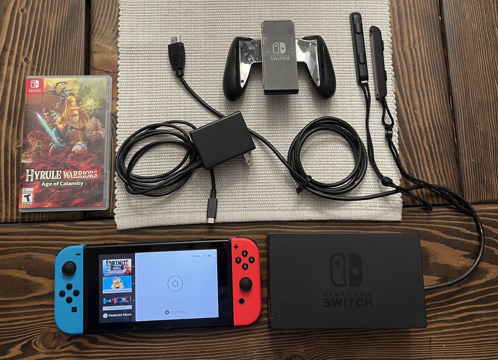 Nintendo Switch in near mint condition and perfect working order. Plus, Hyrule Warriors game and 128 GB storage expansion.
