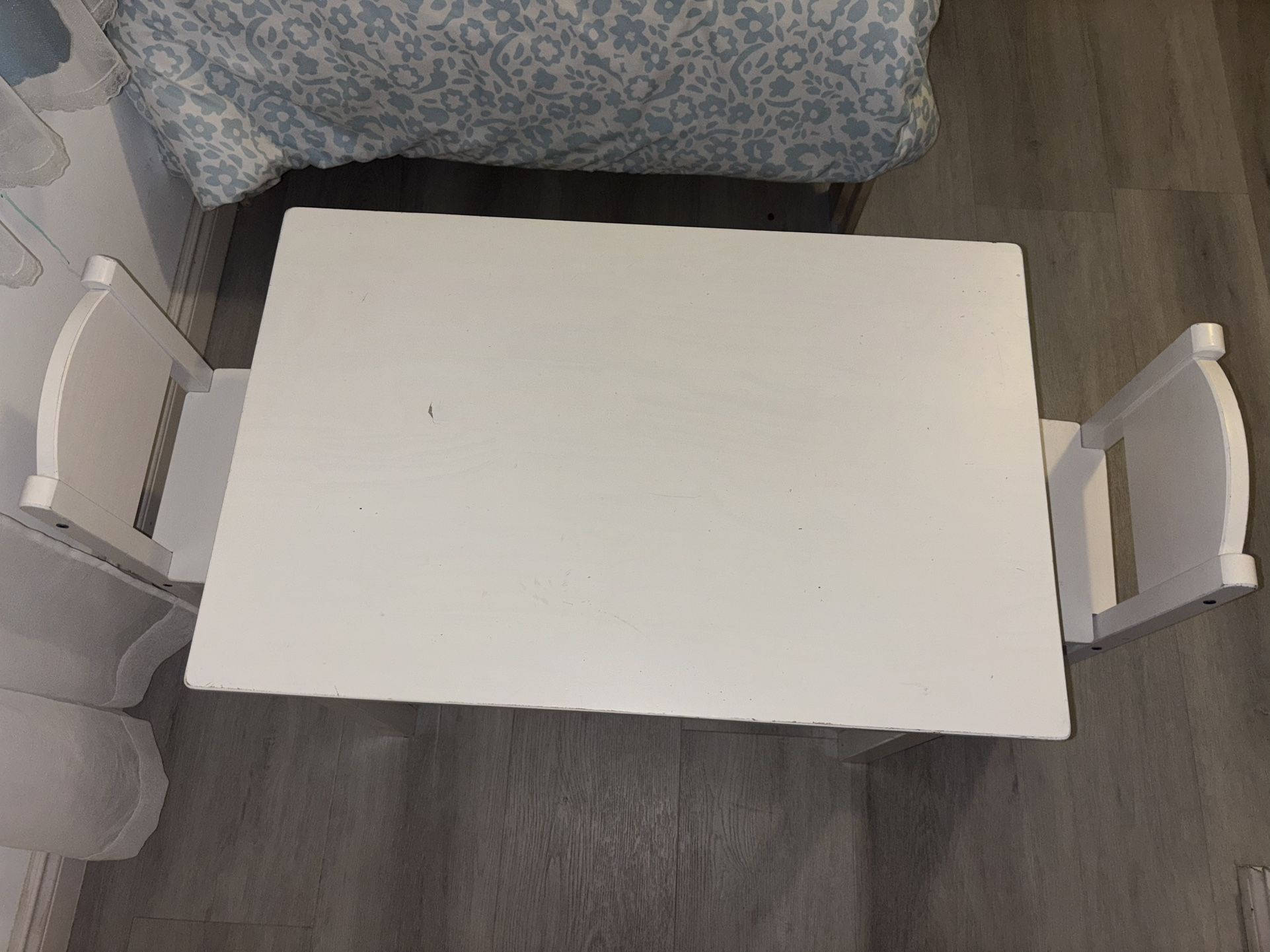 Kids wooden white table in good condition TWO CHAIRS INCLUDED. My kids have outgrown it