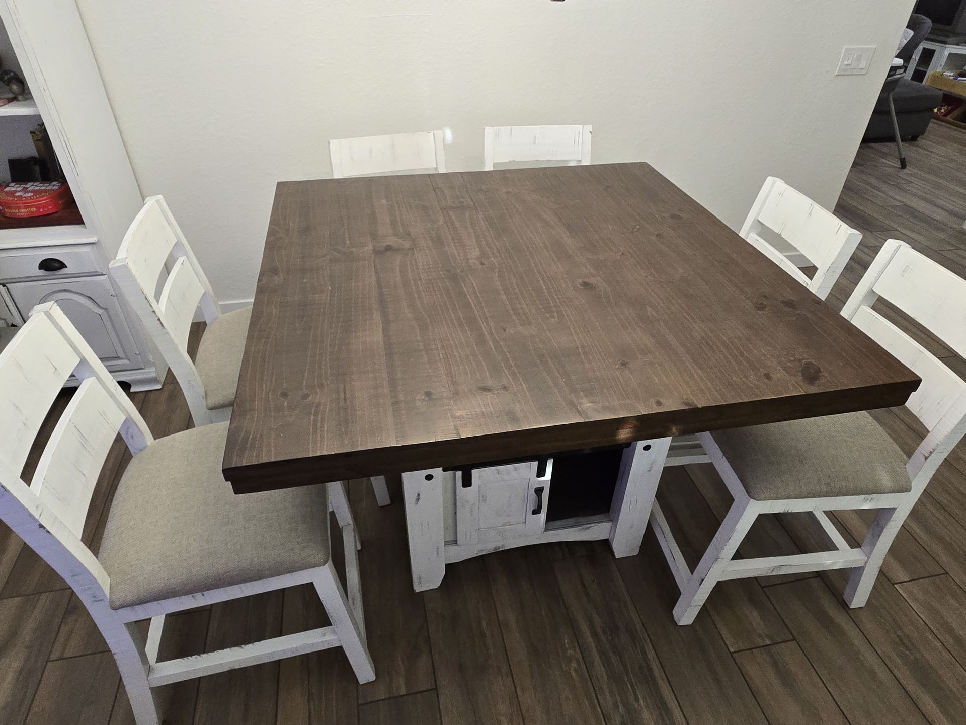 High top farmhouse table with 6 chairs. Table measures 52x52x36. Decent condition, typical knicks scratches and marks. One chair wiggles slightly but was repaired and hardware can be tightened. Good storage underneath. Purchased from American Furniture warehouse roughly 5 years ago. Pickup only at Power and Guadalupe.