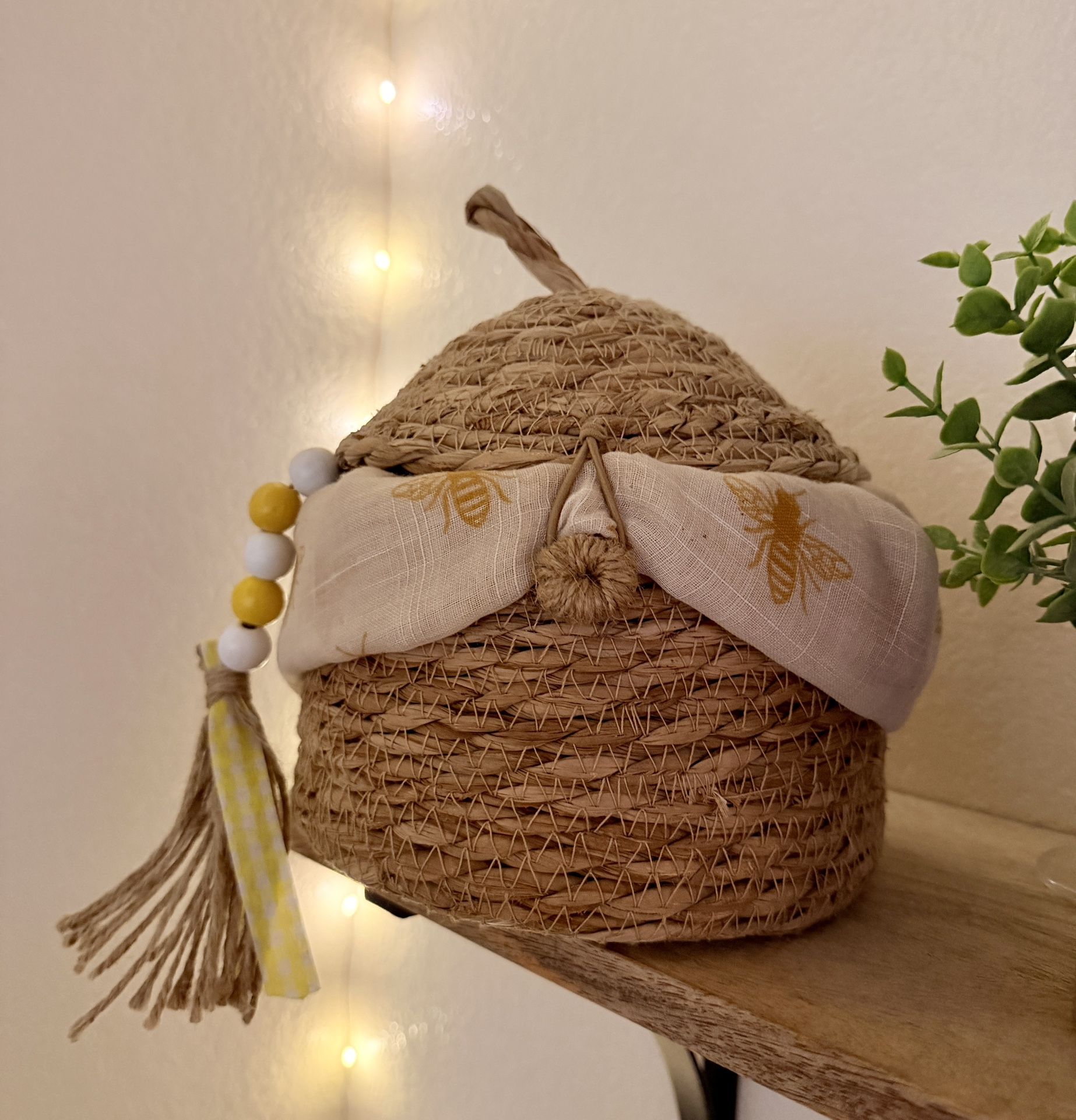 Bee Hive Basket With Bee Cloth And Wooden Beads.
