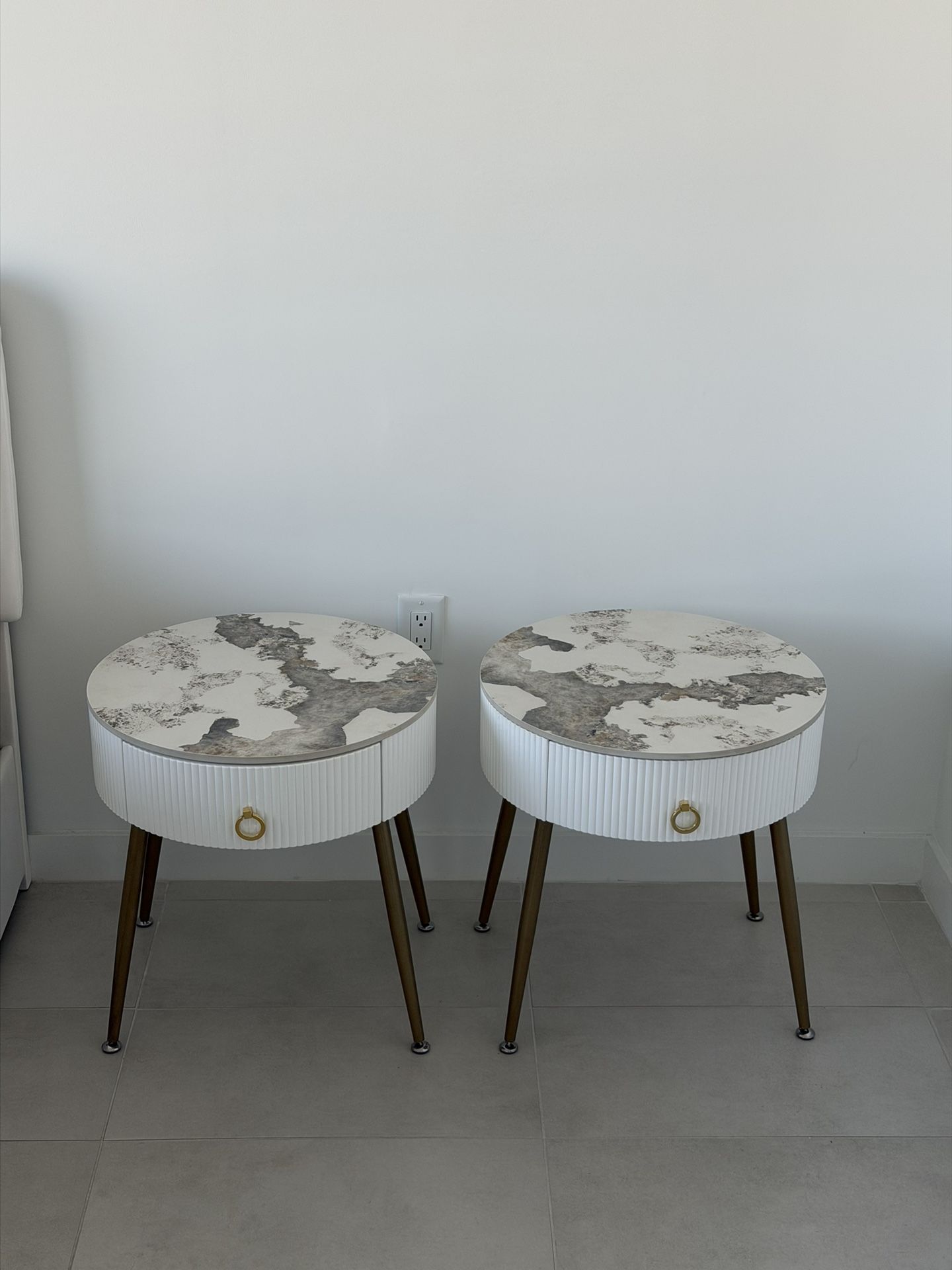 Round Nightstand with Drawer, with Marbling Natural Stone Tabletop and Metal Legs.