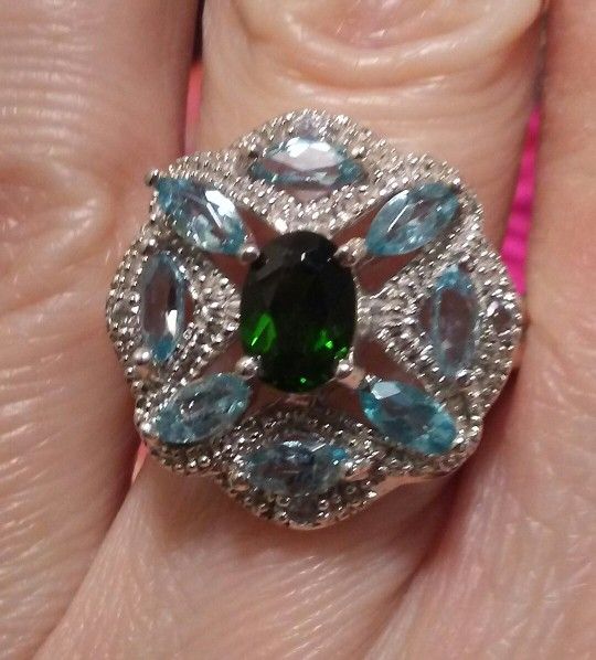Up for sale is this exquisite new stamped 925 sold sterling silver ring SIZE 5.25 with a gorgeous genuine green Sapphire oval shaped center stone and surrounded by genuine blue Topaz and genuine white sparkly Sapphires in this gorgeous cocktail ring setting. This ring is stunning in person! From our smoke-free home.