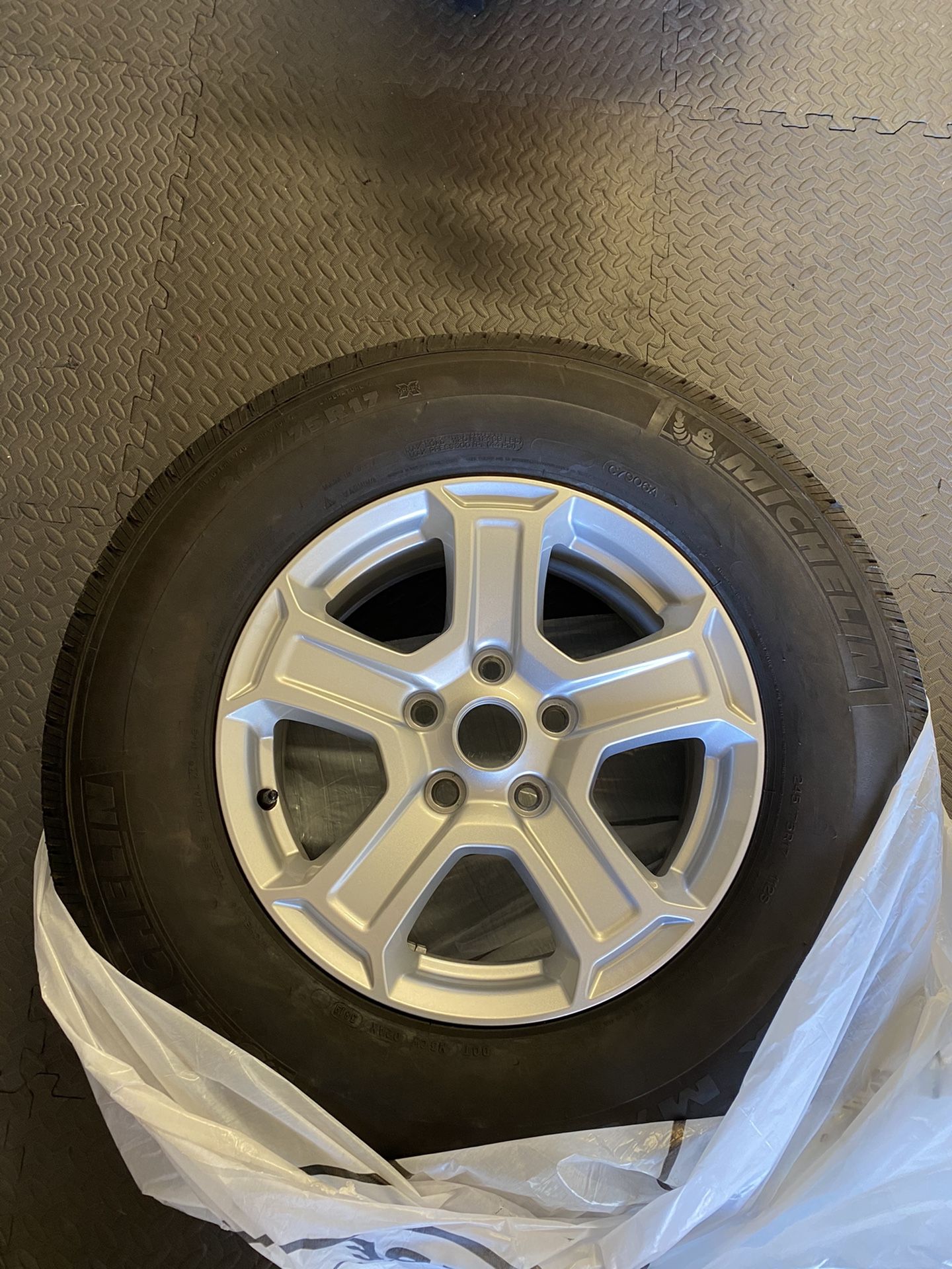 Jeep wrangler set of 5x 245/75/R17 wheels with TPMS Michelin tires. Wheel specs are: 7.5JJx17 ET44.5 and bolt pattern is 5x127. These came off of my 2020 Wrangler. Tires have about 8000 miles on them with plenty of life left. Spare is brand new and never used. Rims/wheels are like brand new.