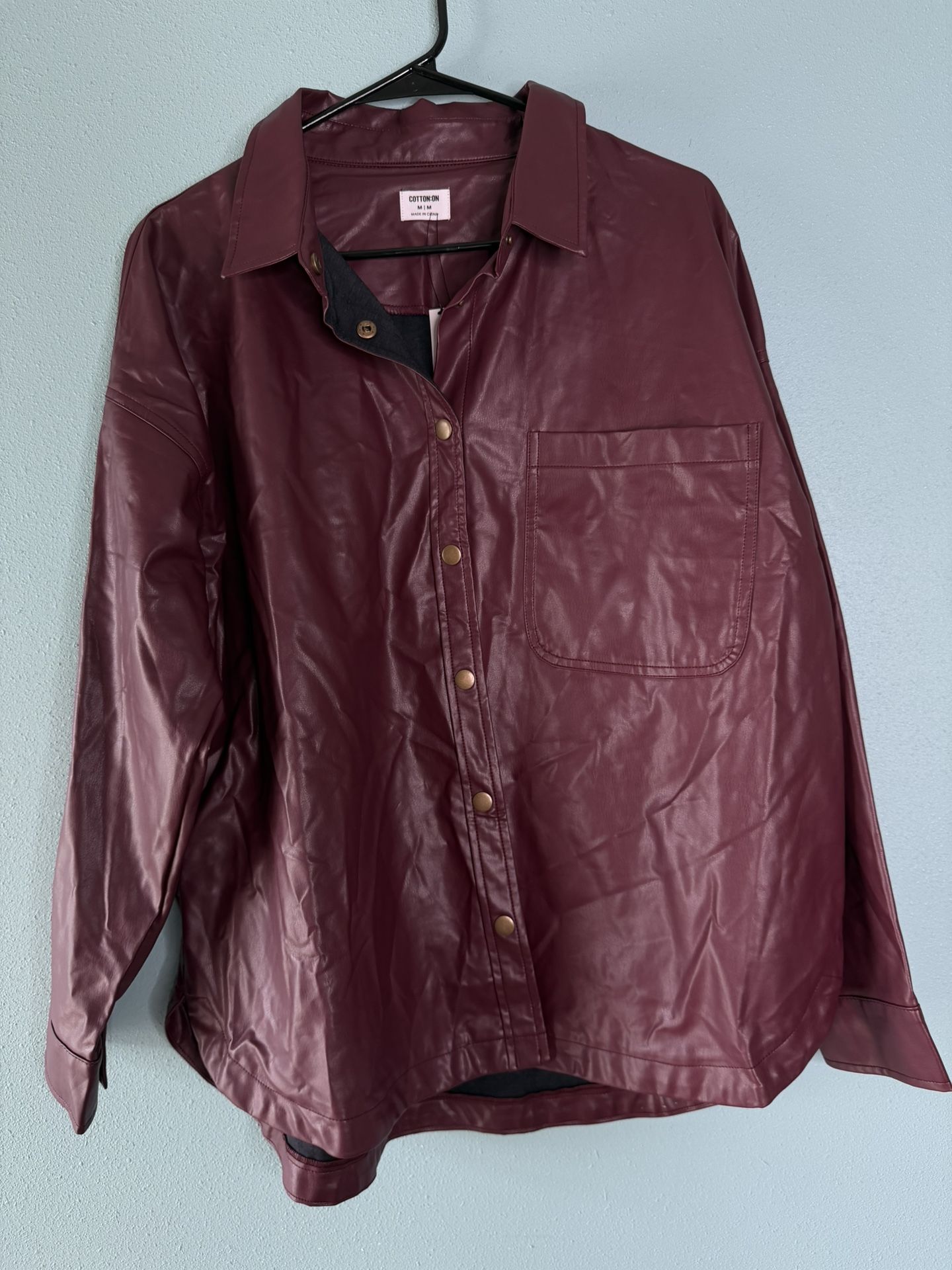 • Vegan leather button-up in a purple-brown shade • Size M, relaxed/oversized fit • Snap button closure and front chest pocket • Soft inner lining • Light wear but overall good condition • No stains or damage • Works as a layering piece or worn on its own