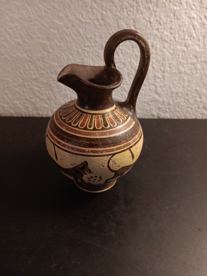 STUNNING VTG Museum Quality Replica 5" Mini Ceramic Lions Grecian Squat Pitcher. Add a touch of antique charm to your collection with this stunning vintage museum-quality replica of a 5" Grecian squat pitcher. Featuring hand-painted ceramic construction, this miniature vase is perfect for displaying on a shelf or using as a decorative piece. The design showcases two ceramic lions on either side, adding a regal flair to the overall aesthetic. Measuring 5 inches in length, this exquisite piece is sure to impress any collector or lover of decorative vases. MINIATURE