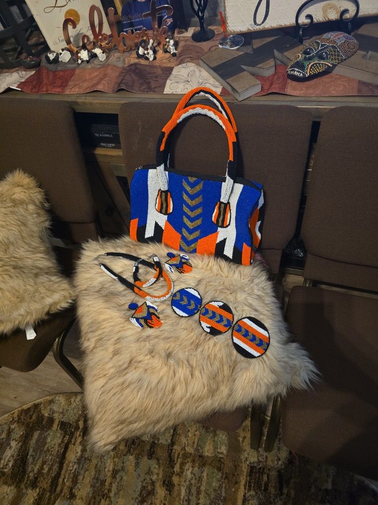 Beautiful beadwork on this vibrant, 4pc set: purse, necklace, bracelet, and earrings. Asking $40 or Best offer.