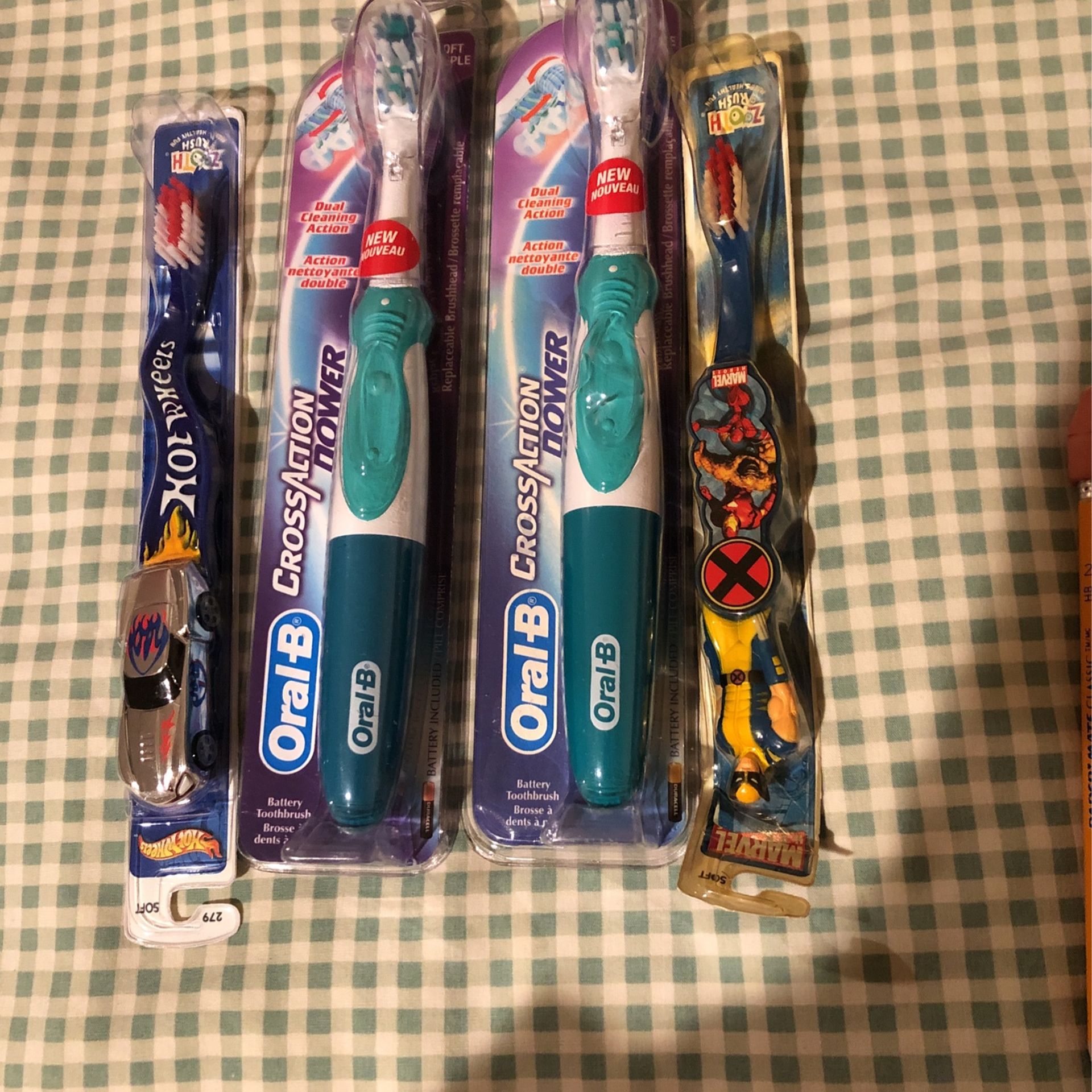 Set of 4 new toothbrushes 2 adults oral B and 2 kids hot wheels and marvel hero