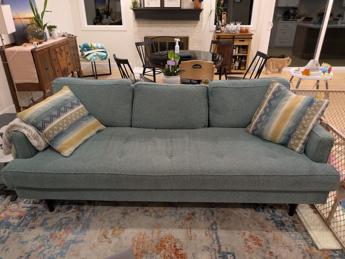 Used fabric couch. Recently moved and doesn't fit in new space. Shows some normal wear and tear (some fraying on arms) but overall in good shape and still comfortable. Was shampooed/wet vacuumed 6 months ago. 90" wide x 40" deep x 32" tall. Comes with the pillows shown. Was in a home with a cat.