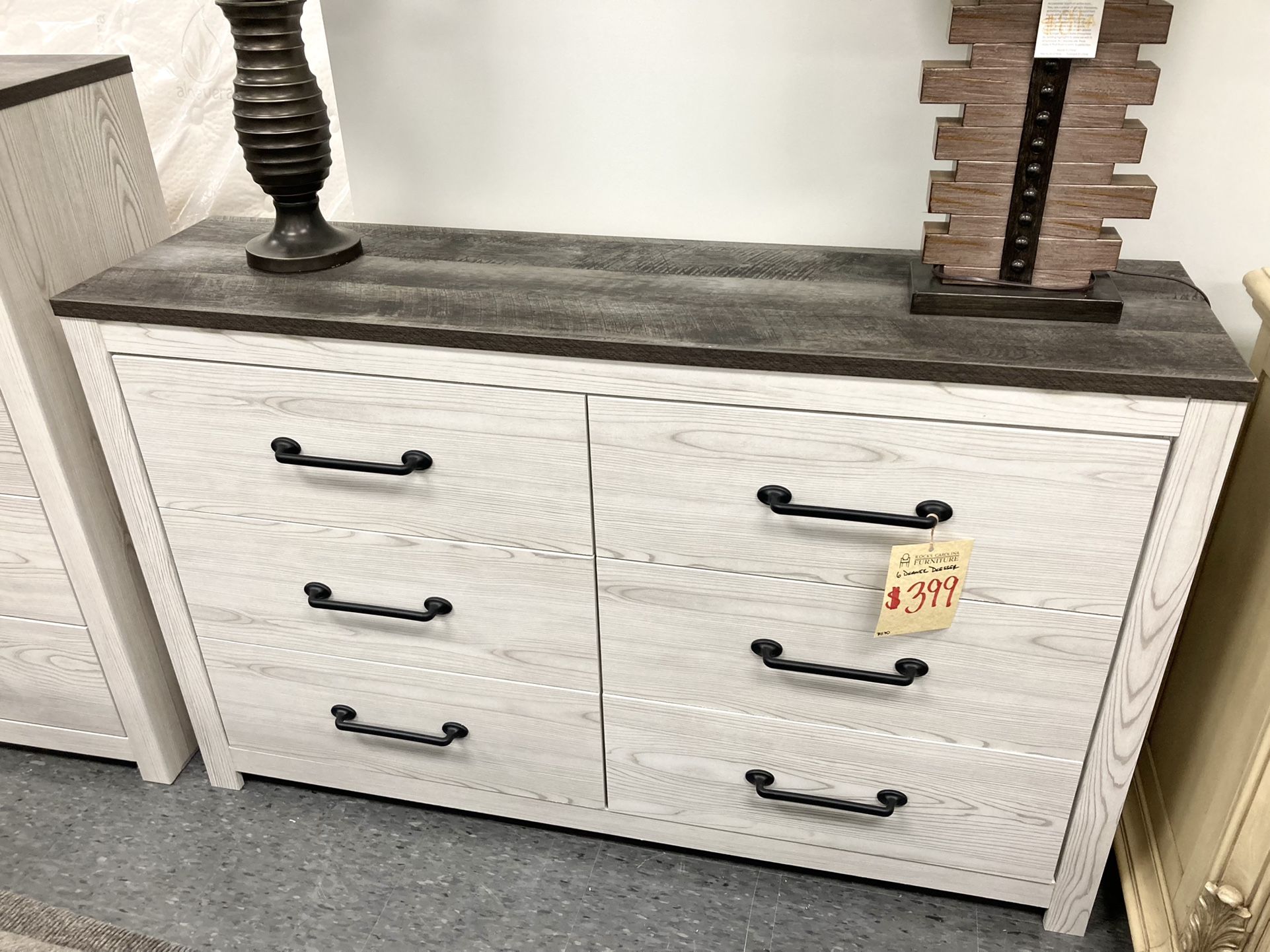 New 6 Drawer Dresser - $399 Versatile Whitewash Finish w/Grey Top In Stock - Available Now!! Rock’s Carolina Furniture 2356 Virginia Beach Blvd Virginia Beach, VA 23454 (next to TJ Maxx @ London Bridge) Open 10 to 7 Monday - Saturday Open 10 to 5 Sunday