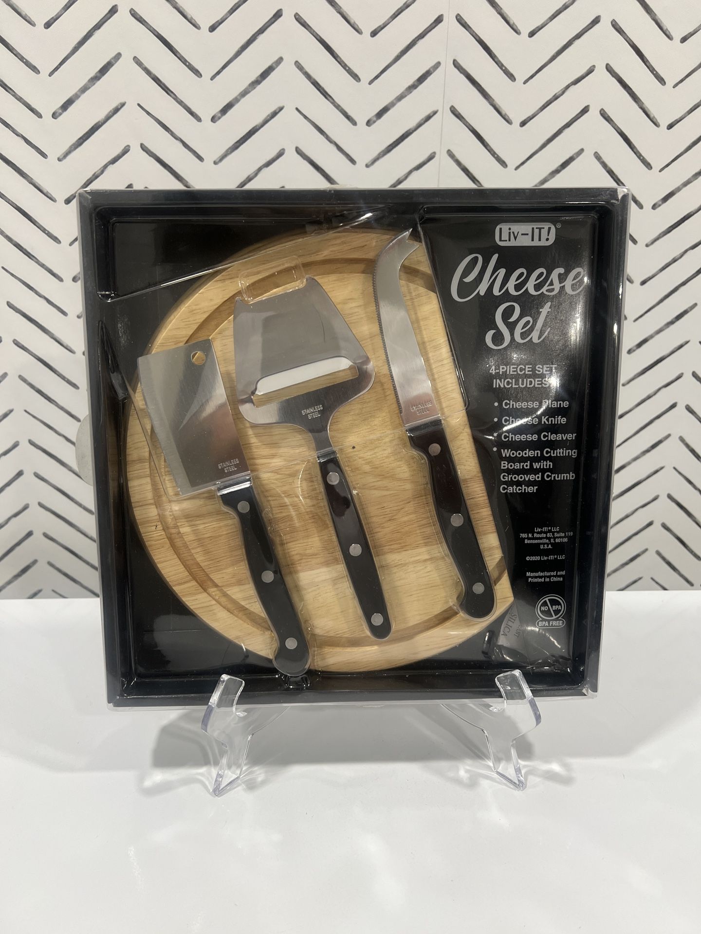 4 piece cheese set - Includes Cheese Plane, Cheese Knife, Cheese Clever, Wooden Cutting Board with Grooved Crumb Catcher. Unopened.