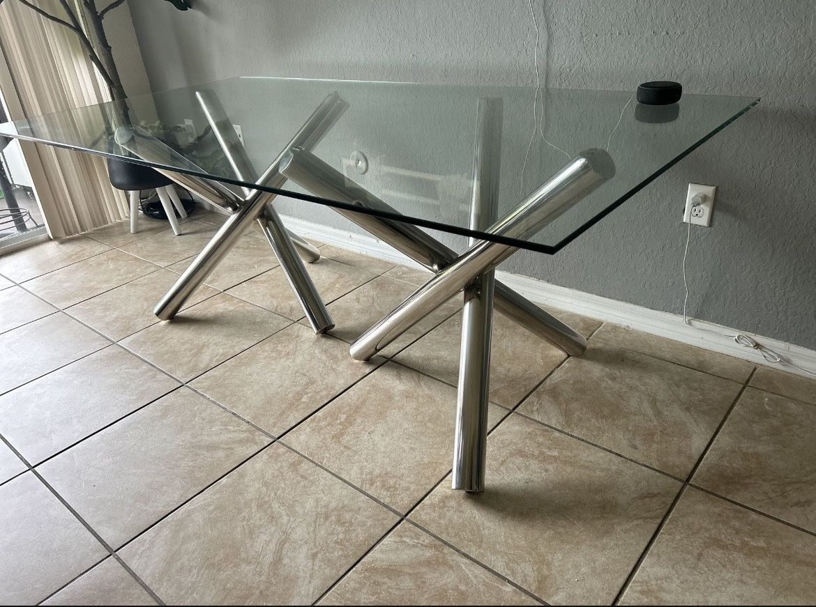 Modern rectangular dining table. Glass top and silver metal legs. Can fit 4 or 6 chairs 7x3