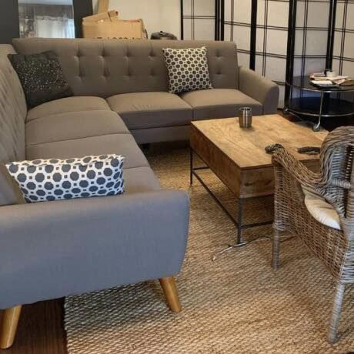 Selling My Gray Mid-Century Modern Tufted Sectional Sofa. Two Sofa Sections, Comfortable Back and Seat Cushions, Smooth Tufted Fabric. Clean. Excellent Shape. Original Condition. Made by Wayfair Furniture. Pickup in 92109 or Delivery with Zipcode. Dimensions: Long Side 107in, Short Side 84in, Height 33in, Depth 36in, Seat 18in.