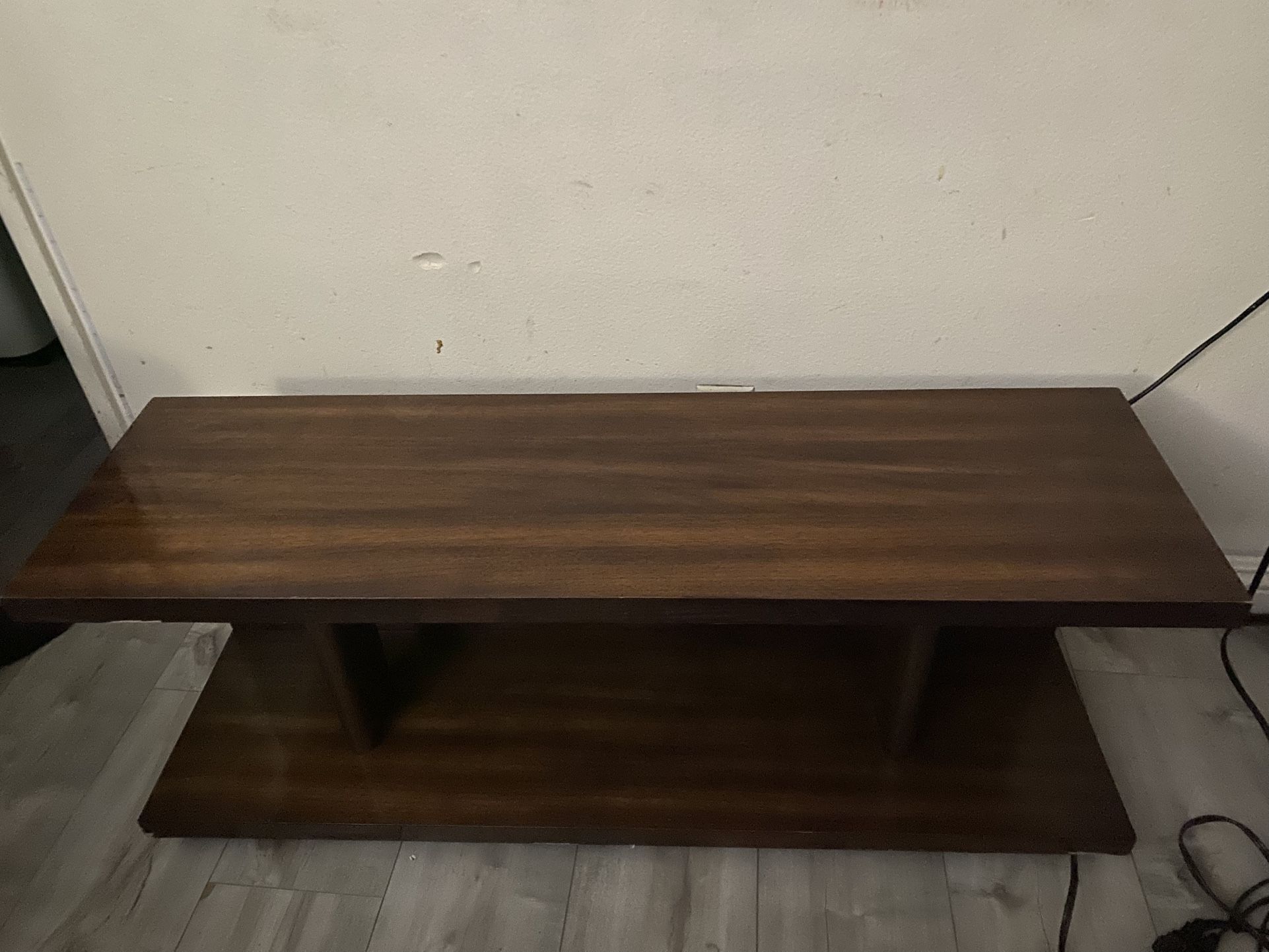 Dark brown wood table (41 in L x 12in W x 14.5 H). Can be used as a side table for the side of your bed, as a tv stand, or any way you want with enough space in the bottom to store anything. It is in good condition and a bit heavy. $150 obo