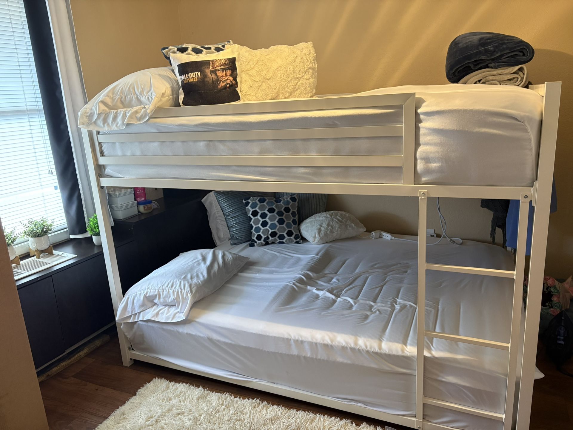 Full-over-Full Metal Bunk Bed, Low-Profile Bunk Bed with Ladder — White, Used (Good Condition). Includes Mattresses. Litera metálica doble litera baja con escalera — Blanca. Usada en buen estado. Incluye los colchones