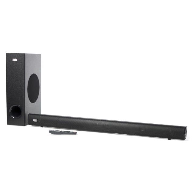Acoustic Audio by Goldwood AASB1102W 2.1 Channel 36-Inch Sound Bar with Wired Subwoofer Amplify your home theater sound system and add super strong bass tones with the Acoustic Audio by Goldwood 2.1 Channel Sound Bar for TV with wired Subwoofer Connects to your TV, Phone, PC or MP3 via HDMI(ARC), Optical, Bluetooth 5.0, USB or AUX Integrated powerful digital amplifier with DSP and 200 Watts system power Easily adjust the bass and treble settings Features 3 listening modes including movie, music, and dialogue to match specific need Wall mountable or table top design Full Function Remote Control Soundbar dimensions (L x W x H): 3 x 35.5 x 3.5 inches Subwoofer dimensions (L x W x H): 16.75 x 4.5 x 9.875 inches Frequency response is 30Hz-20 kHz Efficiency is 92dB at 8 ohm System Requirements Standard US 110V Grounded Wall Outlet Any audio device with Bluetooth or an HDMI (ARC), Optical, 3.5mm headphone audio outputs Applications TV or Home Entertainment System Laptop or Personal Computer DVD or MP3 Player Cell Phone or Tablet Gaming What's in the box 1 Soundbar 1 Subwoofer Remote control Note: The package does not include any wires such as an HDMI, optical, or 3.5mm jack cable to connect from the TV to the sound bar. Also, the subwoofer is missing one of the four pads attached to the bottom. However, the missing pad has no effect as the unit is sufficiently stable with the three remaining pads.