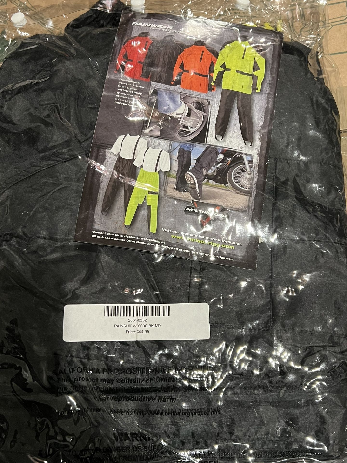 - Includes 2-Piece Black/Black 100-Percent Waterproof Motorcycle Rain Suit - Jacket Features Full-Length Zipper, Self-Fastening Storm Flap, Two Large Outer Pockets and Cooling Vents Under Each Arm - Jacket Offers Soft Corduroy Inner Collar with Hood, Elasticized Waist and Adjustable Cuff with Self-Fastening Tabs - Pants Include Elasticized Waist Band, Cuffs, Boot Stirrups, and Oversized Zipper Gussets. (Does not include suspenders) - Fit type: Universal Fit