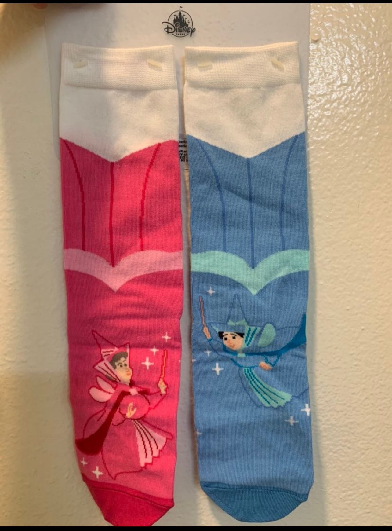Sleeping Beauty fairies with 'Make it Pink' and 'Make it Blue' with one pink sock and one blue sock that match. A definite must have! Comes from a smoke free home. These are adult socks. Both socks are women's size 5-10 and men's size 5-9.